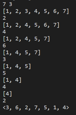 1 2 3 4 5 6 7 - 1 2 4 5 7 + 1 4 5 + 1 4 + 1 4 4 4 4 이런 식으로, 지워야 될 k번째의 수를 지워 가면서 리스트에 append하는 방식을 생각했지만, delete와 extend를 위해 반복문이 두 번 쓰여야 하다 보니 예상대로 시간이 초과되었다.
