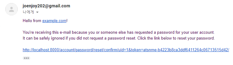에러 메시지를 보니, `패스워드의 초기화 password_reset`의 사용을 위해서는 password_reset_confirm이라는 name을 가지는 함수의 처리가 필요한 것 같습니다.
