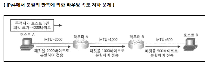 IPv6에서는 오직 출발지 장비만이 패킷을 분할할 수 있도록 규정해 놓았습니다. 그 이유는 IPv4에서 목적지로 가는 경로상의 중간 라우터들이 무분별한 분할을 수행하며 발생했던 라우팅 속도 저하와 관련된 문제 때문입니다.